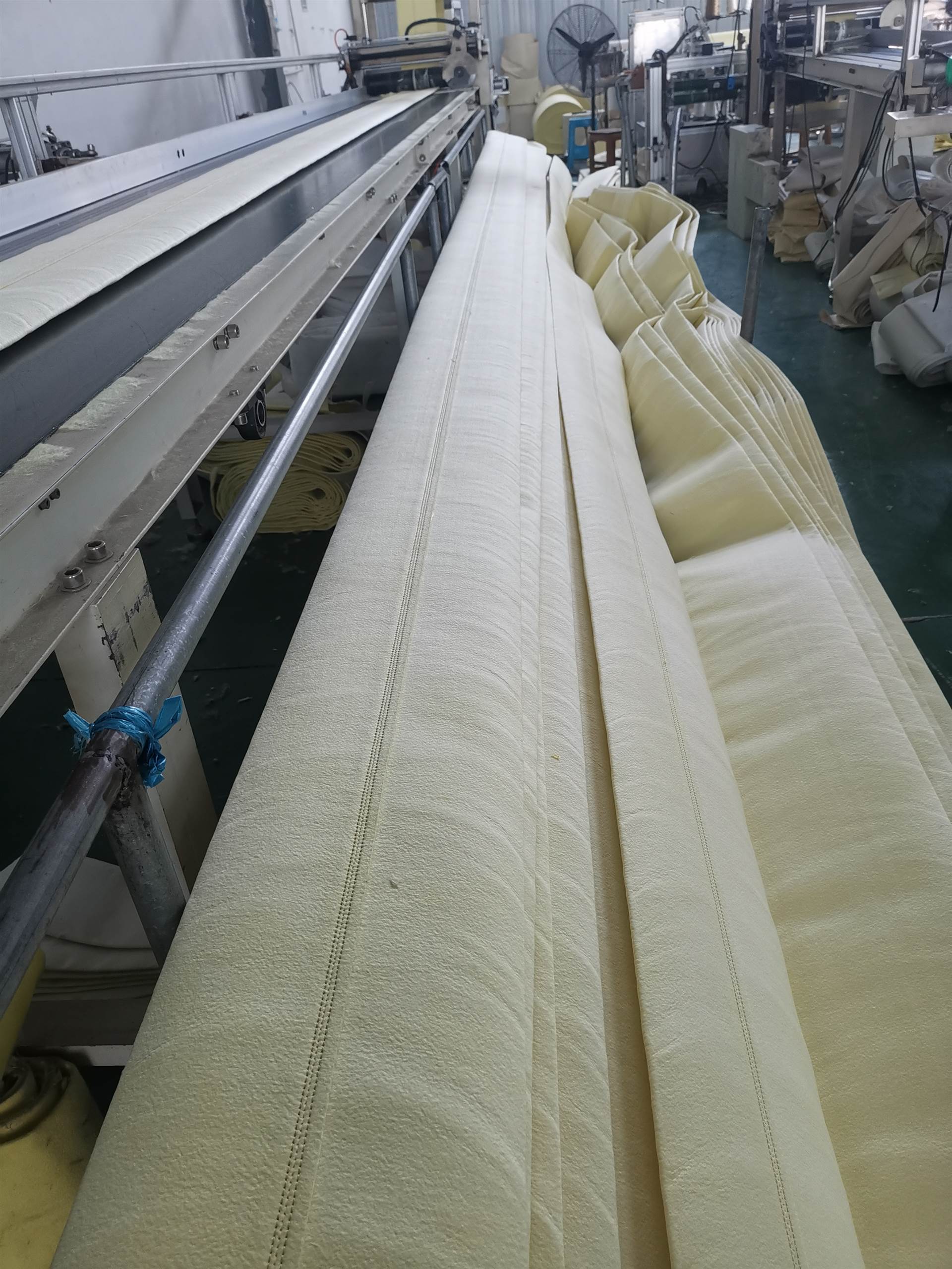 除尘滤袋是脉冲袋式除尘器的核心元件,由滤料编织而成。滤料通常有二种编制方法,一种是按照普通编织网的编织方式,然后再对成品进行烧结,这种编制方式在滤袋的表面有较大的粉尘层,易脱落,表面光滑度差,袋笼易与滤袋的底端摩擦,导致粉尘的局部磨损。另一种编制方式是先将滤料缝好后再采用“扎口式”的方式进行缝制,在底端直接焊好底板。滤袋易保持原有的通风能力及除尘效率,可直接把除尘器上部大敞门设计的气体引入到袋室内。滤料可适用于各类除尘器厂和磨粉等企业的脉冲式收尘器上